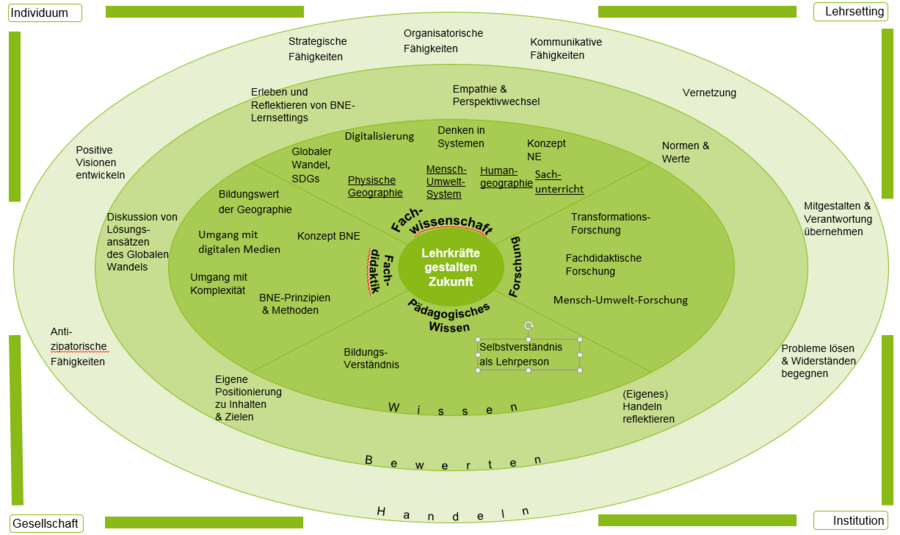 In Bezug auf die Handlungsebene sind beispielsweise die Entwicklung von Visionen, kommunikative und antizipatorische Fähigkeiten und die Übernahme von Verantwortung von Bedeutung. Den Rahmen für das gesamte Modell bilden dabei die Dimensionen des Individuums, der Gesellschaft, der Institution sowie des Lehrsettings.