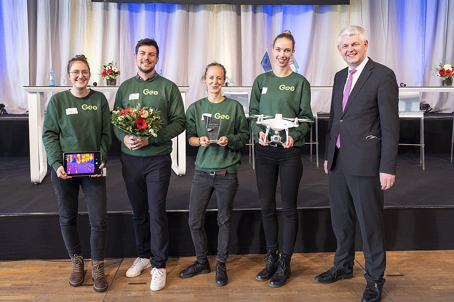 Das GeoIT-Schülerlabor hat am Freitag, den 12.11.2021, die Ehre gehabt, als eines der fünf besten vom EFRE.NRW geförderten Projekte am Wettbewerb EFRE.Stars.NordrheinWestfalen teilzunehmen. In der Veranstaltungslocation in Düsseldorf direkt am Rhein hoben wir uns mit unseren grünen GeoIT-Pullovern deutlich von den anderen Projektteilnehmer*innen ab. In einem festlichen Rahmen durften wir das digitale GeoIT Mensch-Umwelt-Schülerlabor in einem zweiminütigen Pitch den Mitglieder*innen des EFRE-Ausschusses vorstellen und unsere Experimente exemplarisch präsentieren. Neben der Vorstellung der anderen vier Projekte konnten uns die Podiumsdiskussion und die Reden vom Staatssekretär des Ministeriums für Wirtschaft, Innovation, Digitalisierung und Energie des Landes Nordrhein-Westfalen, Christoph Dammermann, einen differenzierten Blick auf den EFRE in NRW geben und machten Schlussfolgerungen für die neue Förderperiode möglich. Besonders erfreulich für das GeoIT-Schülerlabor waren nicht nur die vielen positiven Rückmeldungen zu unserem Projekt, sondern auch der Pokal als Auszeichnung für den dritten Platz von insgesamt 35 teilnehmenden Projekten.